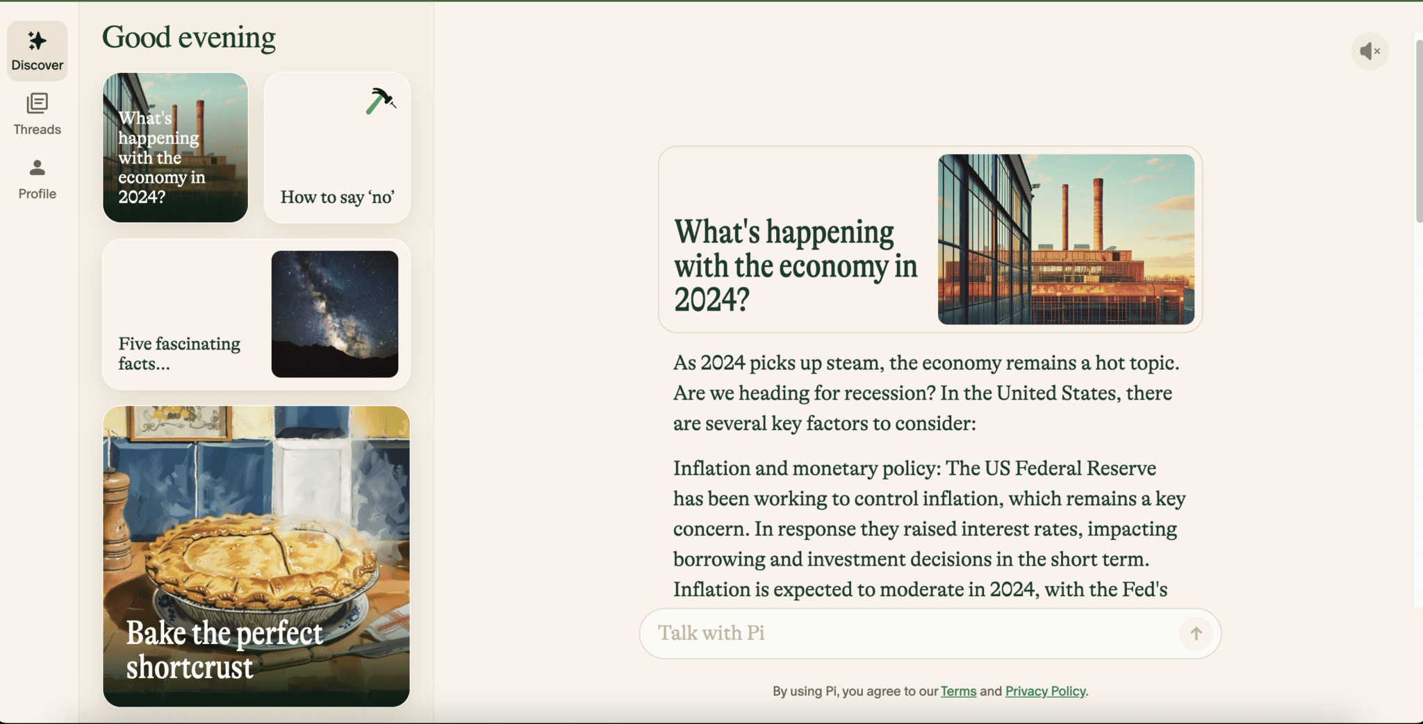 It aims to provide a supportive and empathetic user experience, with a design philosophy centered around being kind, curious, and creative. Pi's responses are crafted to be more personal and emotionally engaging, making it suitable for users seeking companionship or emotional support. However, this makes Pi's scope in handling in-depth informational requests or content generation more limited than ChatGPT's. This is due to constraints on input and output length and its focused approach on personal interaction rather than factual accuracy or content creation.