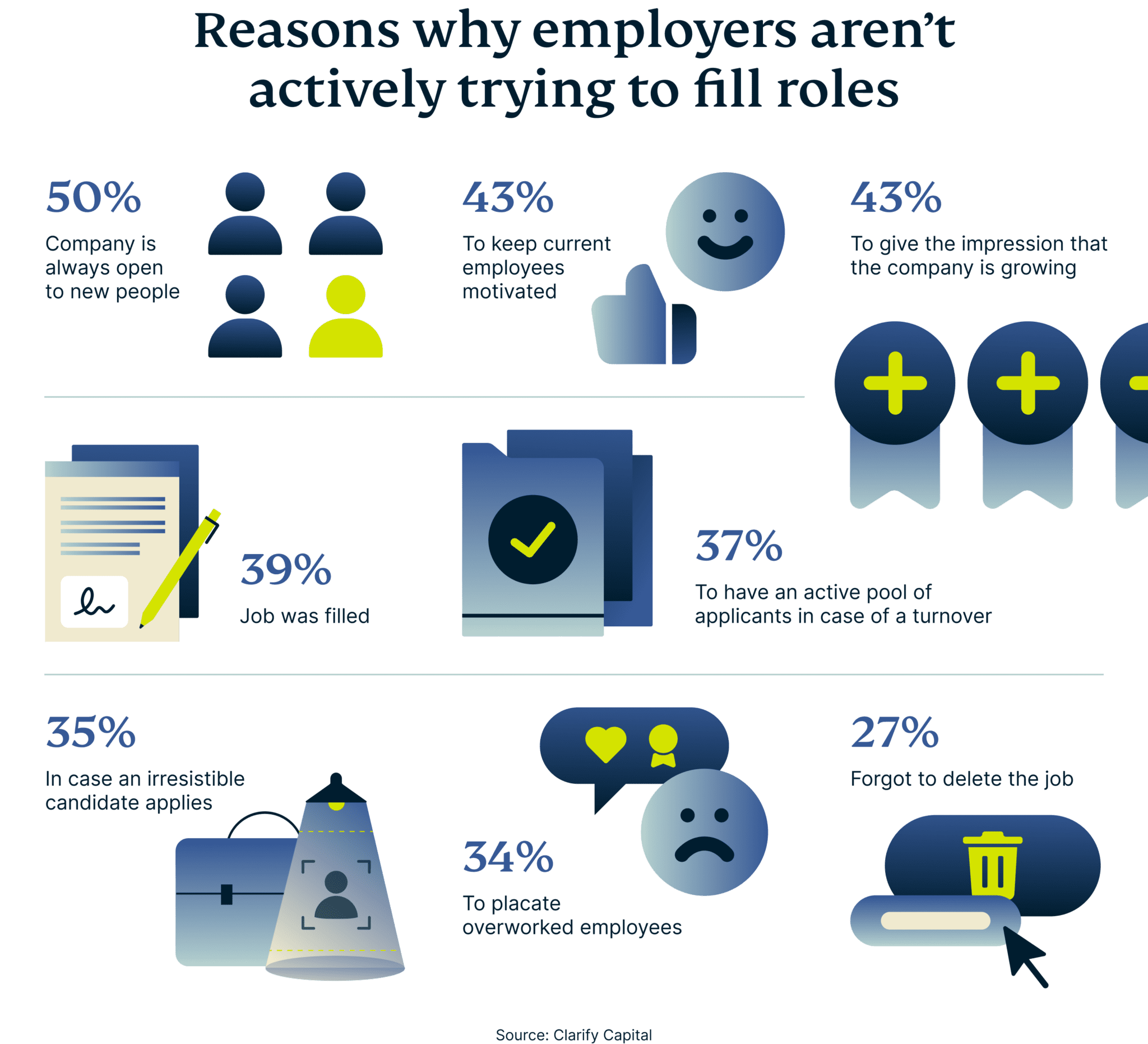 - A study by Clarify Capital found that while many employers keep ghost jobs listed just in case a good candidate applies, 43% of ghost job posters do so to give the impression that the company is growing.