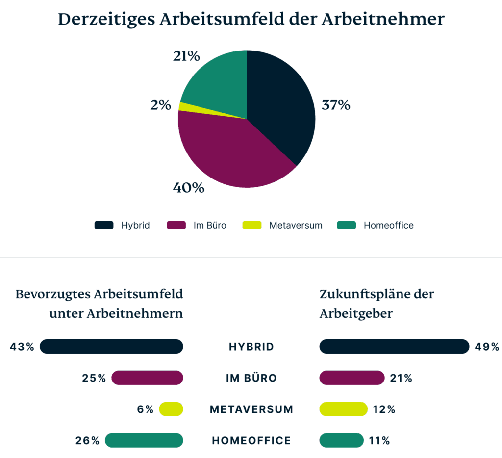 - Wer interessiert sich dafür? 77 % der Arbeitgeber bekundeten ihr Interesse an immersiven Arbeitsumgebungen wie dem Metaversum, verglichen mit nur 57 % der Arbeitnehmer. (Springen Sie zu diesem Bereich.)