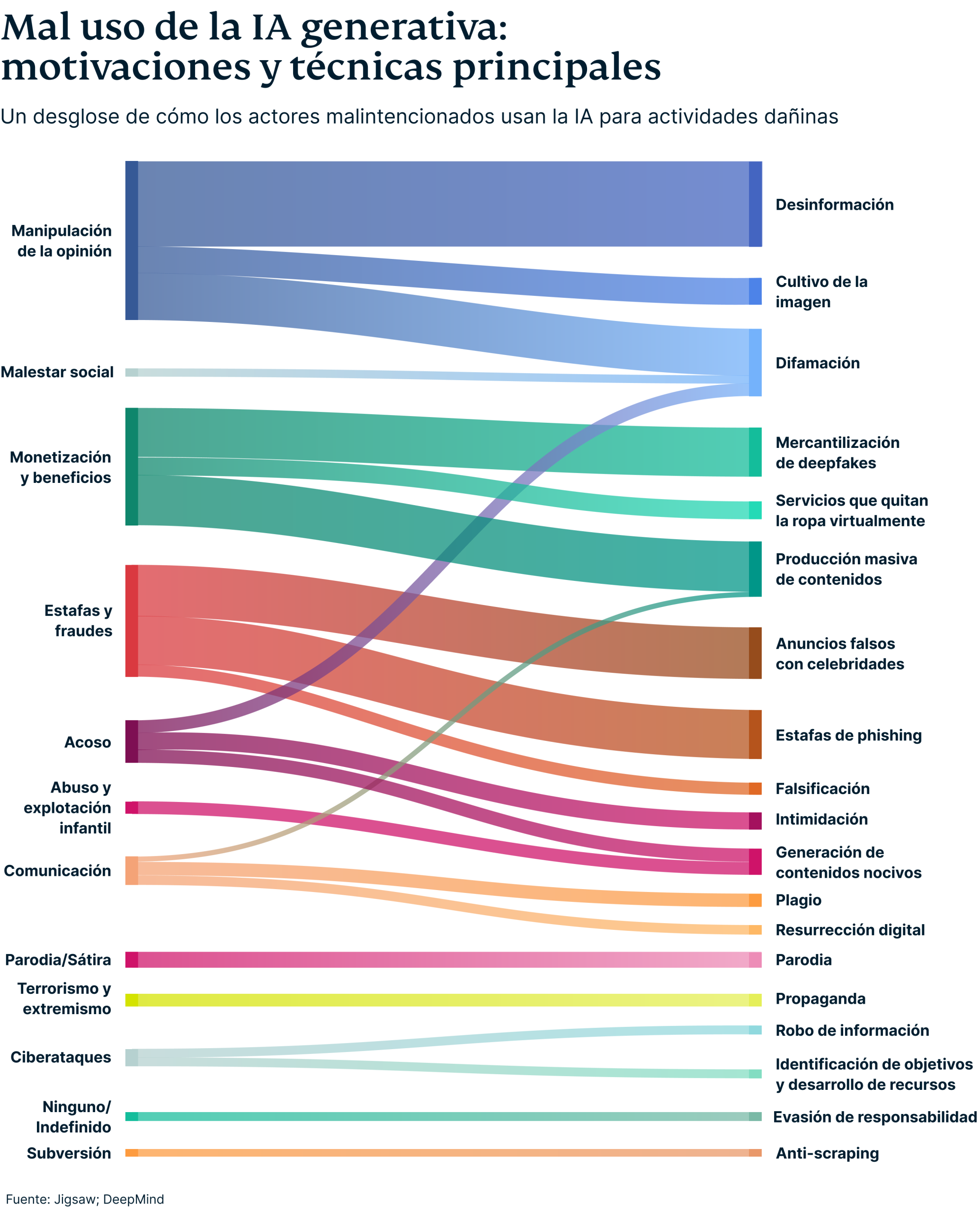 Un estudio reciente de Google DeepMind descubrió que influir en la opinión pública es el objetivo malintencionado más común del uso de la IA generativa, principalmente a través de los medios deepfake. Esta creación de imágenes, videos y audio de personas realistas pero falsos era casi dos veces más común que el siguiente uso malintencionado más frecuente de las herramientas de IA generativa, que era la creación de contenidos online de desinformación basados en texto.