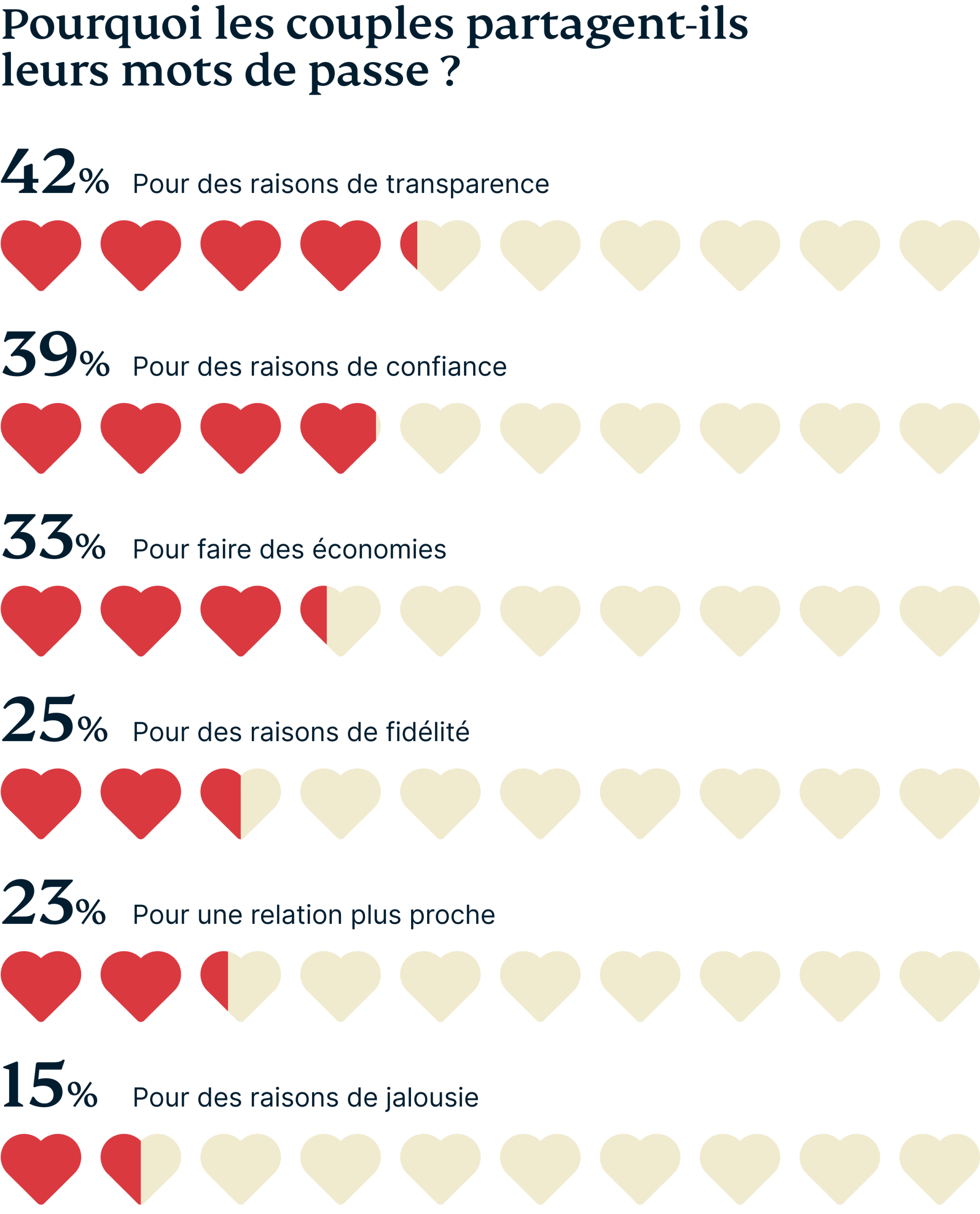 Qu'est-ce qui pousse les couples à partager leurs identifiants ? Il est clair que ce n'est pas seulement une question de nécessité ou par simplicité. Un bon nombre de personnes interrogées pensent que le partage d'un mot de passe est un signe de confiance (39 %), de fidélité (25 %), de transparence (42 %) et, oui, certains admettent le faire pour économiser de l’argent (33 %).