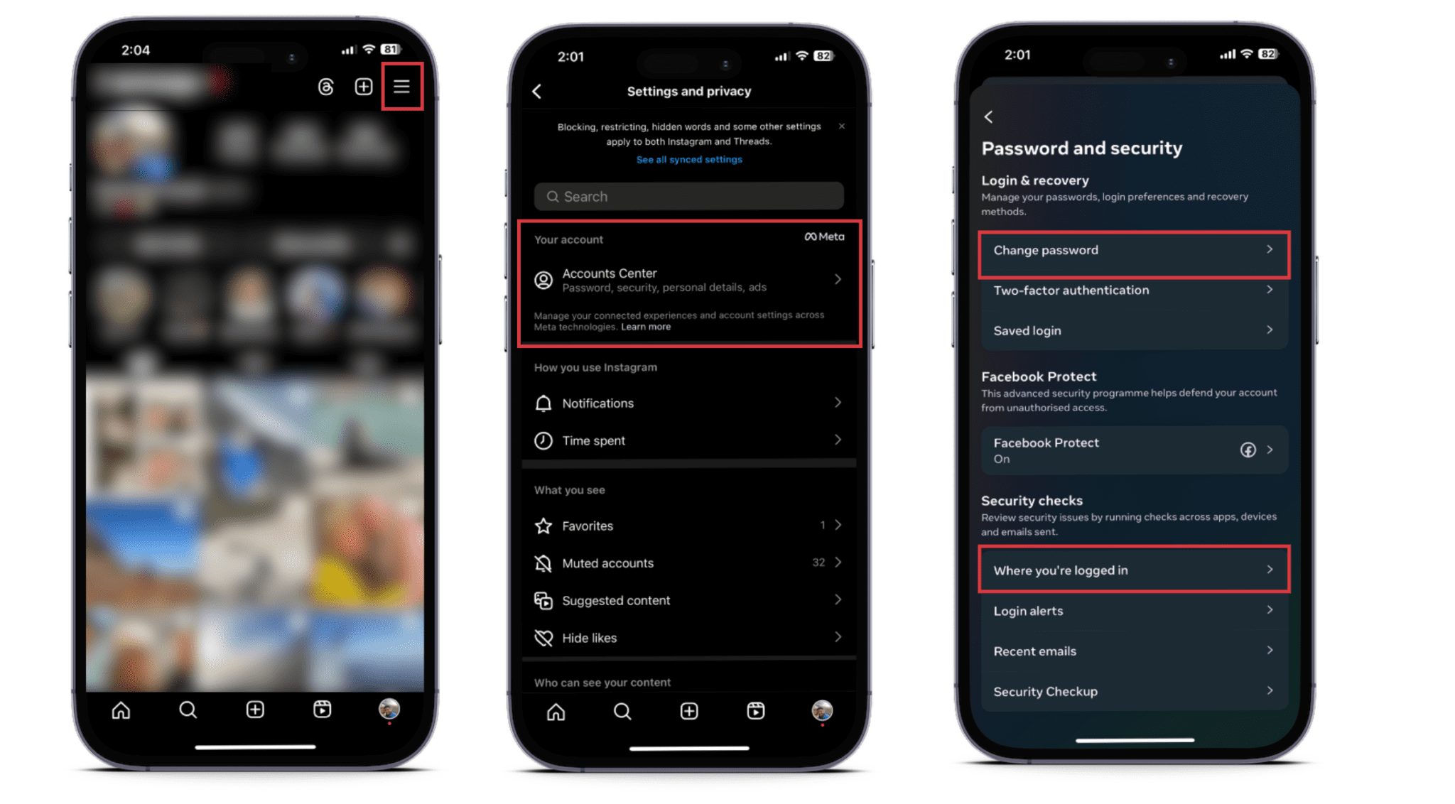 いつも通りインスタのアカウントにログインできた場合、自分のデバイスでサインインしている場合は、すぐにパスワードを変更して、侵入者が個人情報を編集したり、写真を消去したり、プロフィールに何だか分からないものを投稿したりする前に、ハッカーを追い出しましょう。