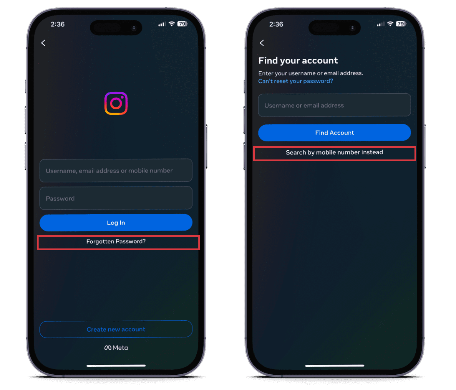 - Instagramのログインページで、パスワードを忘れた場合をタップ