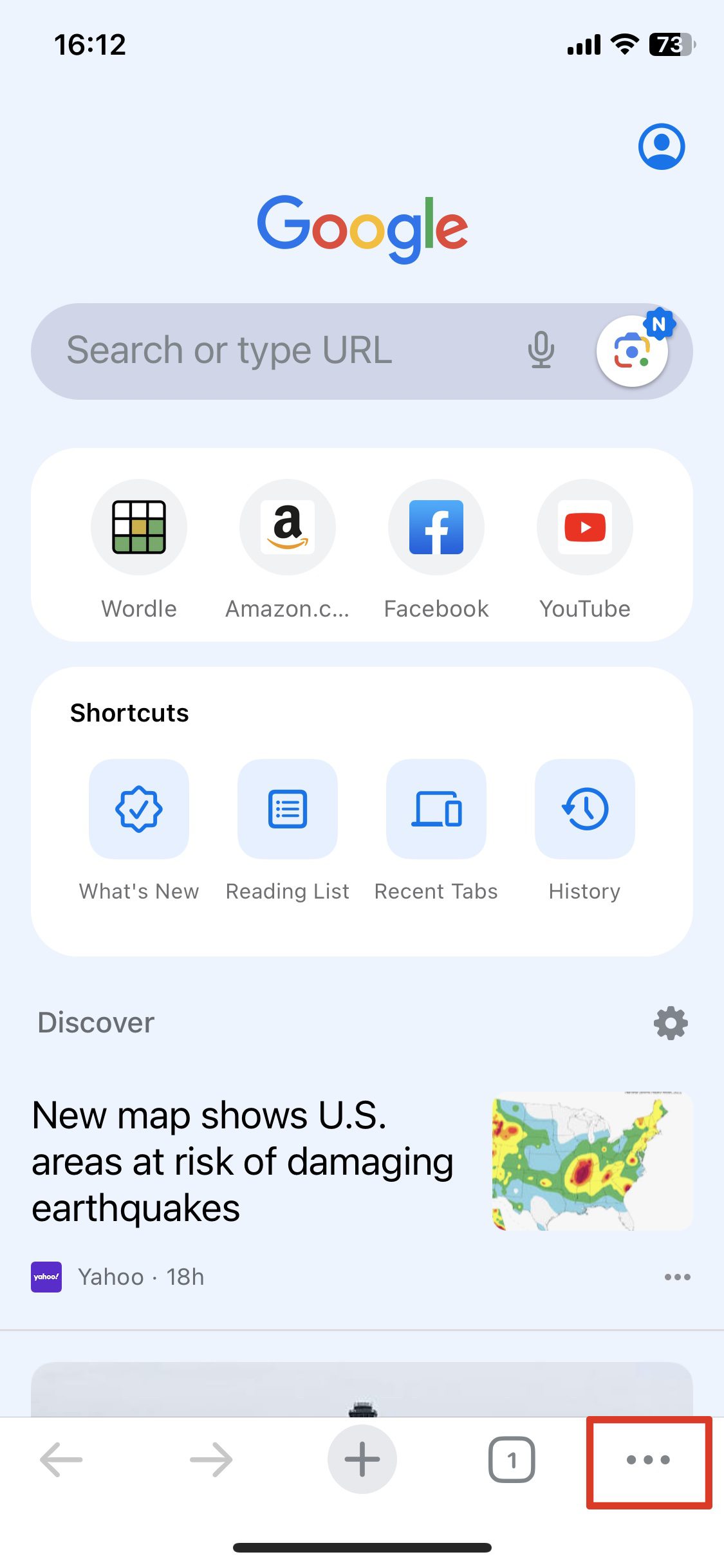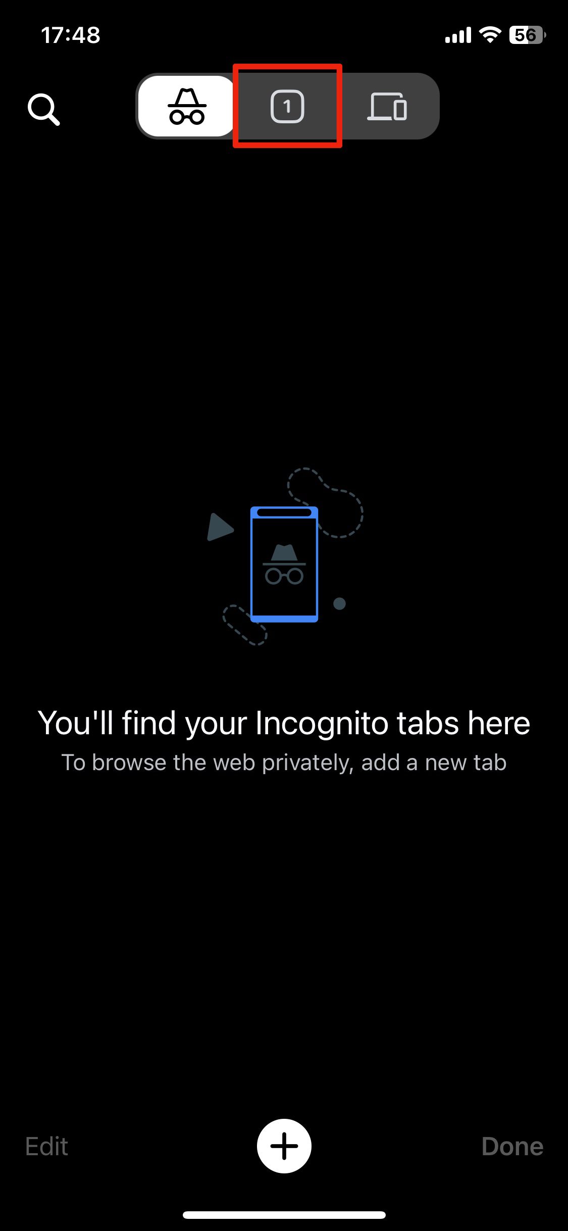 5. タブボタンをタップします。これにより、シークレットモードから通常モードにブラウザが変わります。タブボタンは画面中央上に表示され、非シークレットモードで開かれたタブ数を表示する数字が入ります。