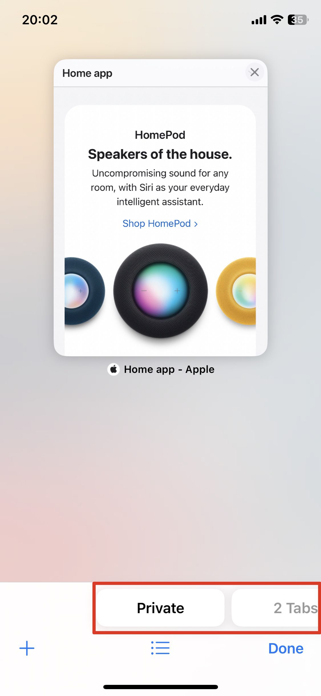 3. これで、開いたタブの一覧が見えます。画面の下に、開いたタブ数を表示するボタンが表示されます。そのボタンを右にスワイプするか、グレーで表示されたプライベートボタンをタップします