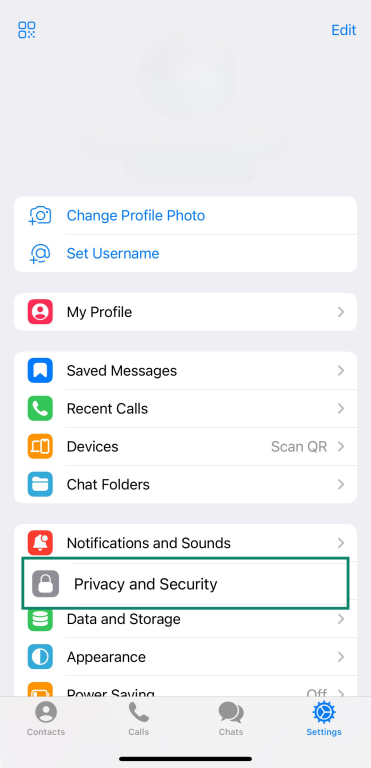 Telegram app settings page showing profile, privacy, and security options.