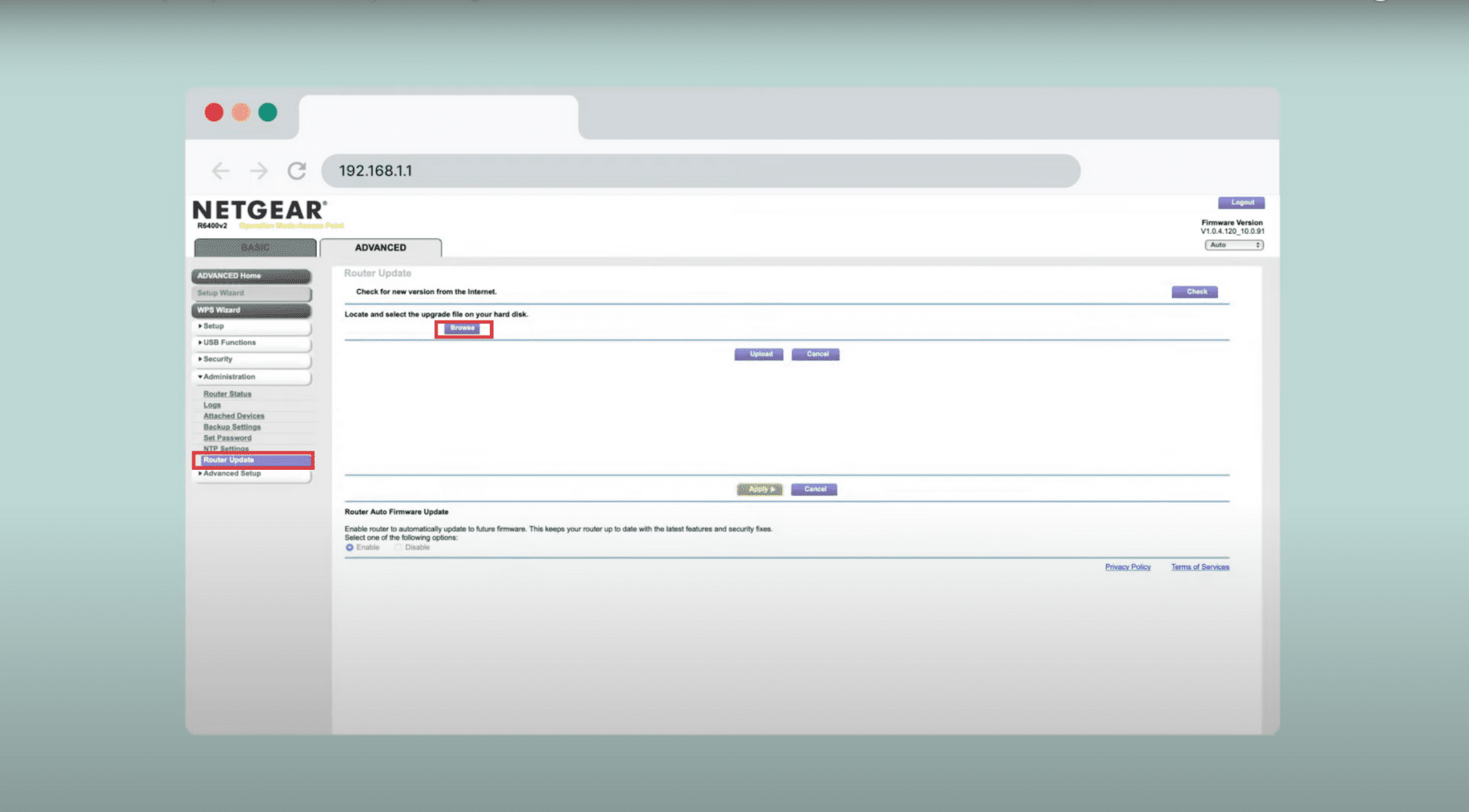 예를 들어, Netgear 공유기의 경우, 고급(Advanced) 탭을 선택한 후, 관리(Administration) 섹션으로 이동하여 공유기 업데이트(Router Update)를 선택합니다.