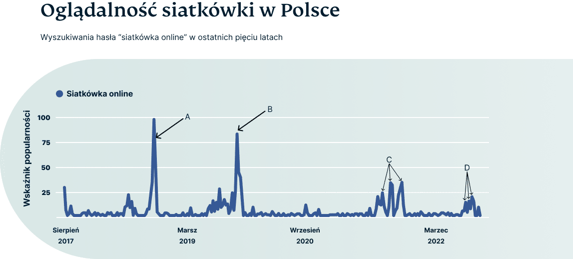 Reprezentacja Polski w piłce siatkowej zajmuje obecnie pierwsze miejsce w rankingach Międzynarodowej Federacji Piłki Siatkowej założonej 26 lipca 2022 r. Polska była mistrzem świata w latach 1974, 2014 i 2018, a w 2022 roku walczymy o utrzymanie tytułu. Na załączonej grafice zaobserwować można daty, w których Polacy najczęściej wyszukiwali hasło siatkówka online w ostatnich pięciu latach.