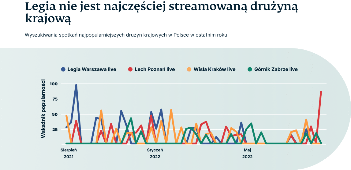 Spośród wszystkich klubów PKO Ekstraklasy największą liczbą obserwujących na Facebooku pochwalić się może Legia Warszawa. Jeśli jednak wyszukujemy spotkania danych drużyn na żywo, widzimy wyraźny spadek oglądalności Legii w ostatnim roku na rzecz innych zespołów.