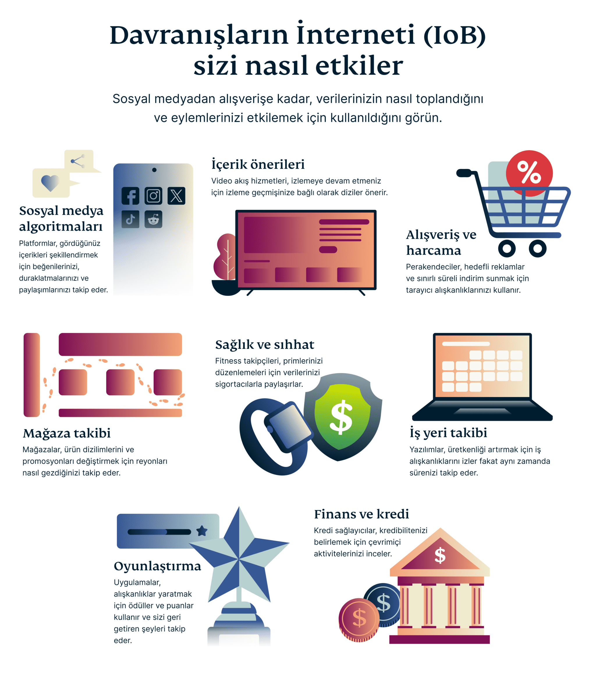 • Davranışların İnterneti (IoB), veri takibinin bir sonraki evrimidir. Yapay zeka ve davranış bilimini kullanarak her tıklamayı, kaydırmayı ve aramayı analiz eder; basit bir kişiselleştirmenin ötesine geçerek seçimlerinizi öngörür ve etkiler.