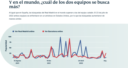 Una pregunta inevitable en el panorama futbolístico español es: ¿se busca más el Real Madrid o el Barcelona? La rivalidad entre ambos equipos va más allá de las fronteras españolas. En el resto del mundo, ¿qué equipo es el más popular? La temporada pasada, el Real Madrid jugó 56 partidos y el Barcelona 53 partidos de acuerdo con FBREF; aún así, concluimos que el término más popular es “ver Real Madrid online”. Cuando ambos equipos se enfrentan en un “Clásico” las búsquedas crecen a la par, con resultados idénticos.