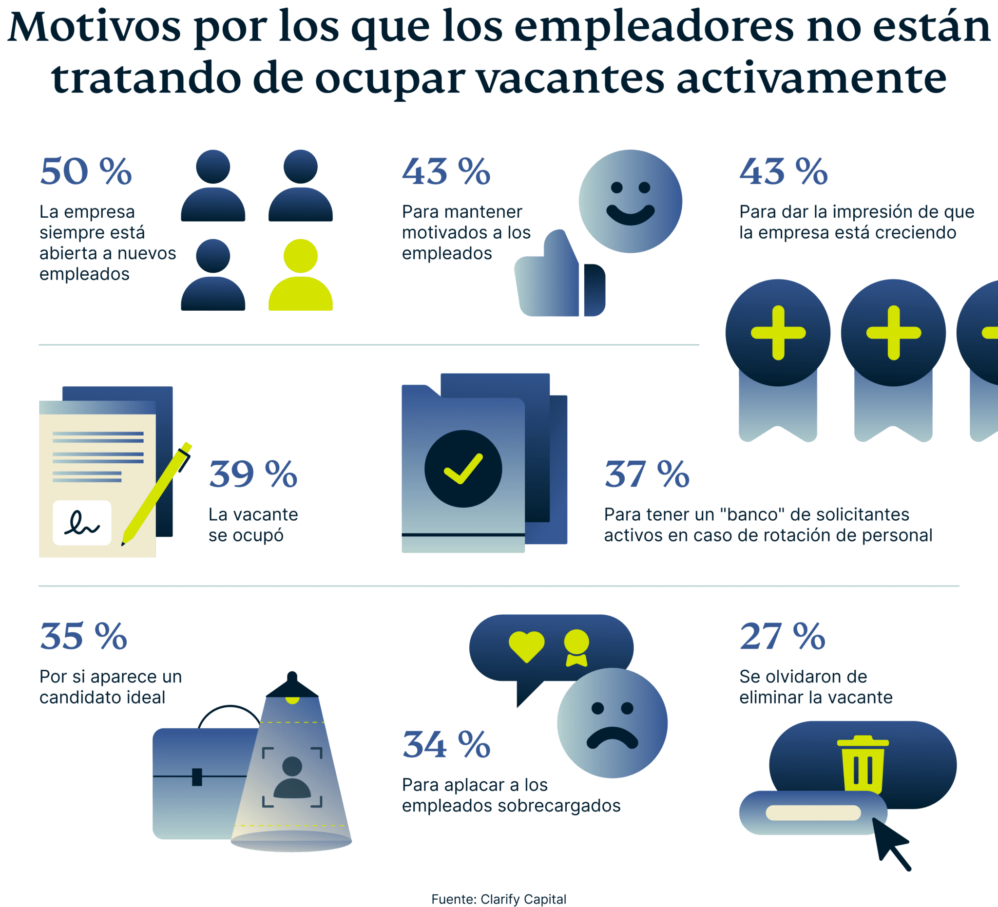 - Un estudio de Clarify Capital descubrió que, si bien muchos empleadores mantienen los empleos fantasma listados por si acaso se presenta un buen candidato, el 43% de los que publican empleos fantasma lo hacen para dar la impresión de que la empresa está creciendo.
