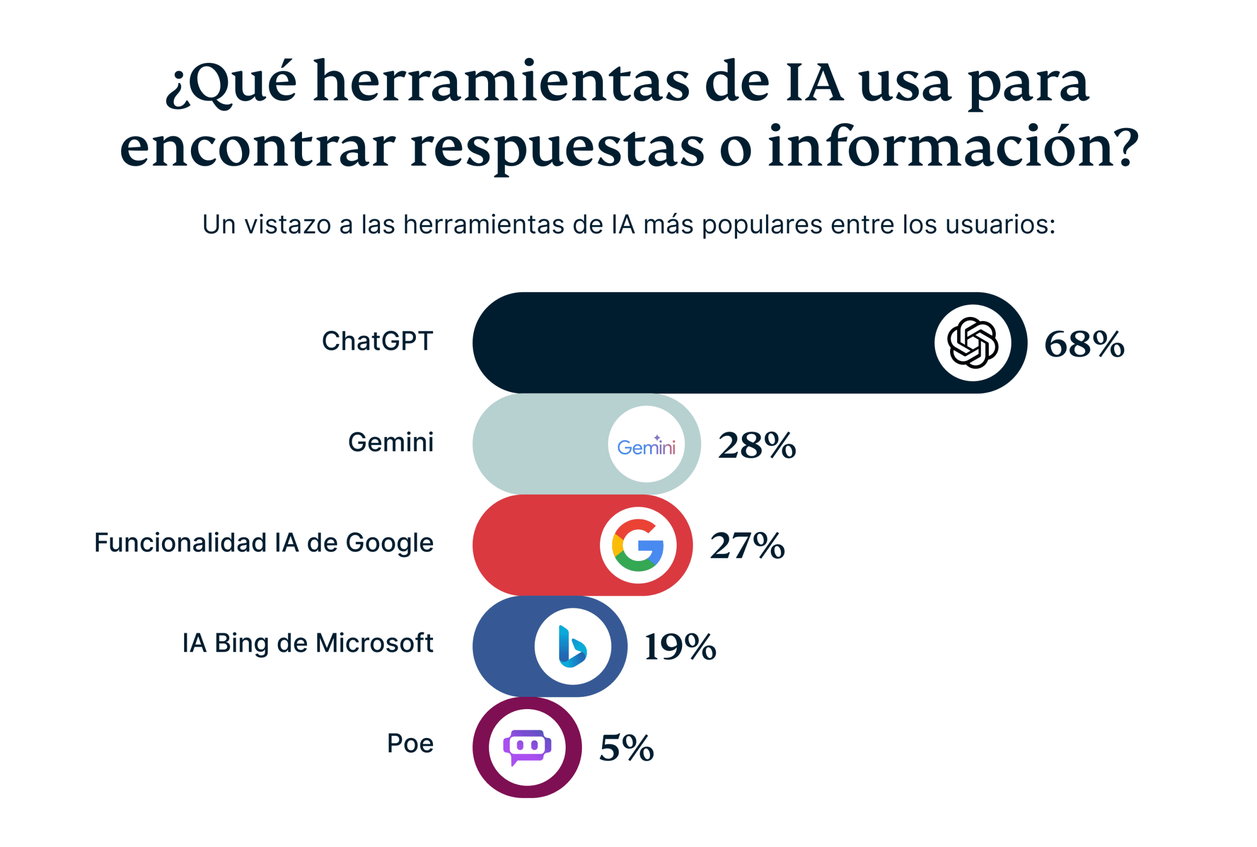 Cuando se trata de herramientas de IA, ChatGPT es el claro favorito. Casi 7 de cada 10 usuarios (68%) lo nombran como su opción principal para responder preguntas, mientras que competidores como Gemini (28%) y Bard (27%) quedan rezagados. El formato conversacional de ChatGPT y su capacidad para ofrecer respuestas detalladas lo han convertido en una herramienta destacada, especialmente para los usuarios más jóvenes que buscan respuestas personalizadas y atractivas.