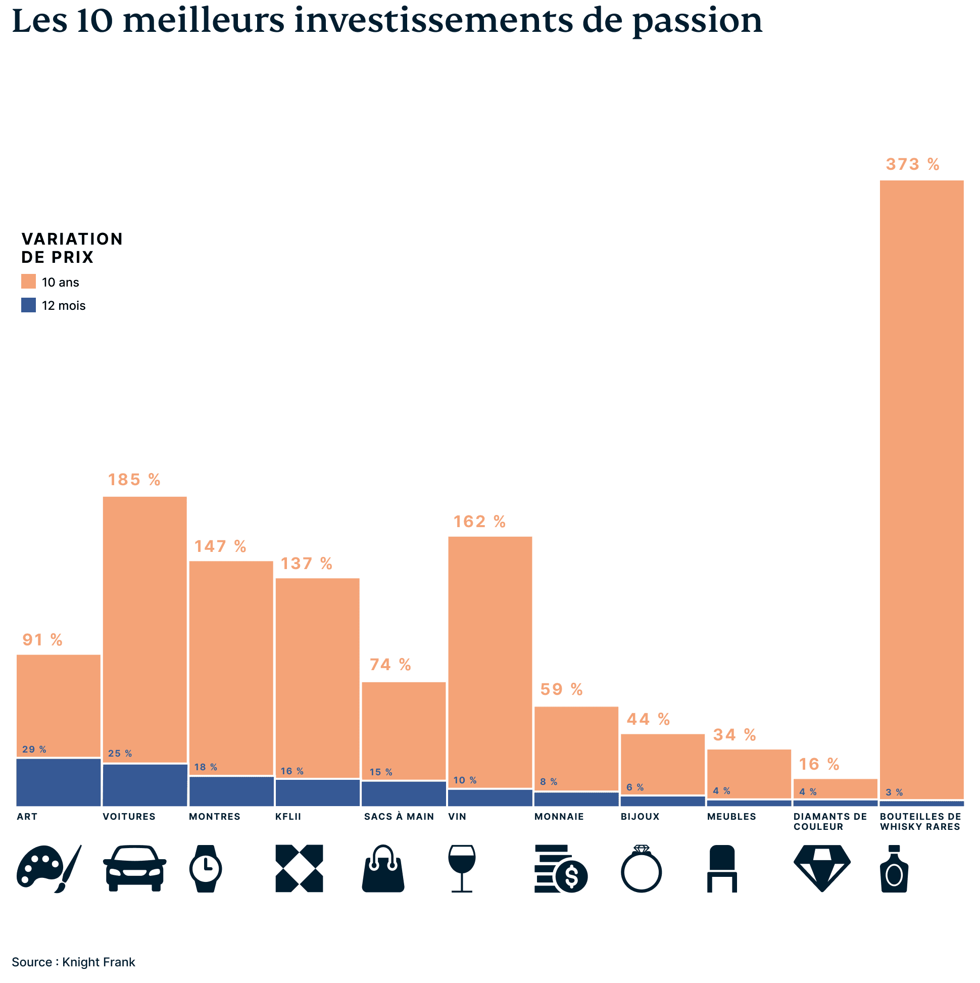 • Les investissements de passion comme le whisky rare, les beaux-arts, les objets de luxe et les voitures sont relativement stables par rapport au bitcoin et offrent des rendements élevés.