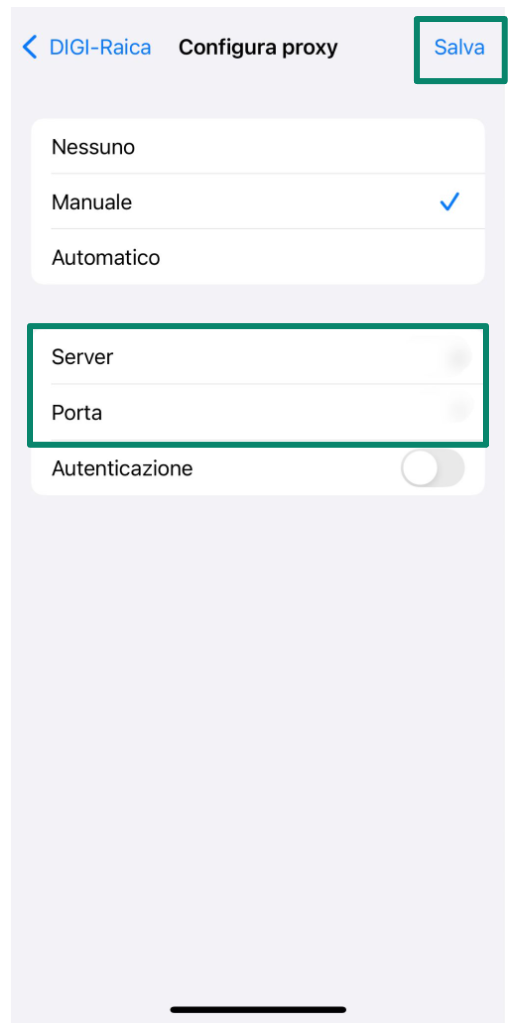 - Inserisci l'indirizzo del server proxy e il numero di porta fornito dal servizio, quindi premi Salva.