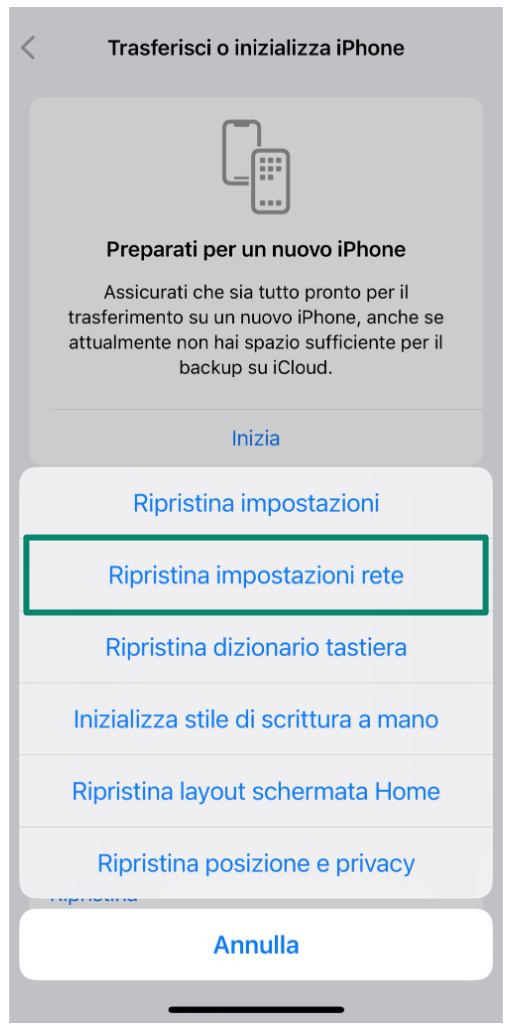 - Scegli Ripristina impostazioni di rete. L'iPhone si riavvierà e le precedenti impostazioni di rete verranno cancellate.