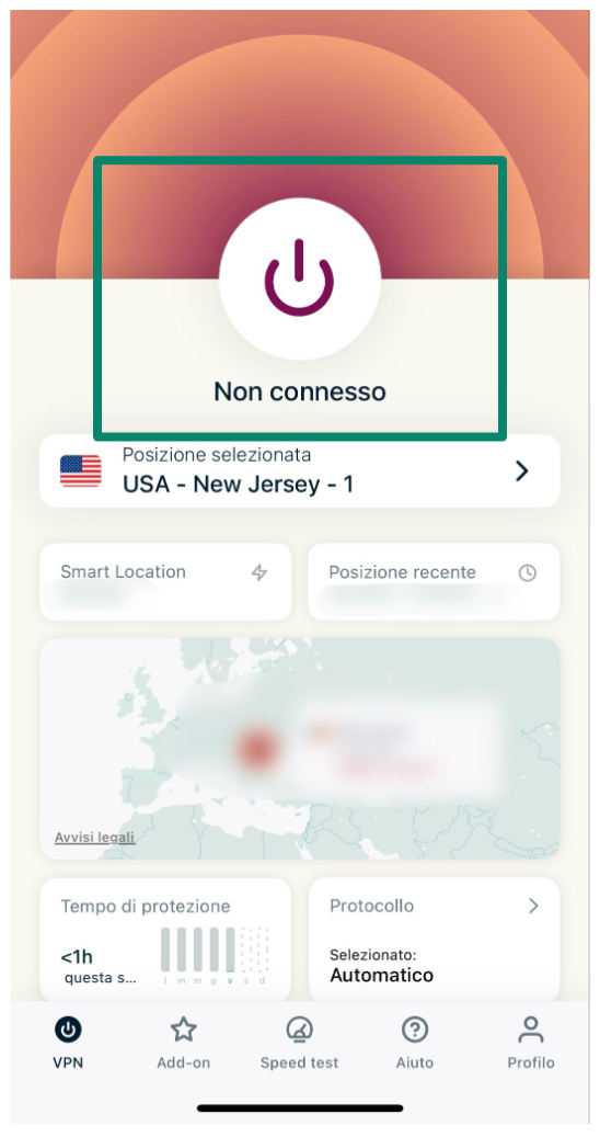 - Premi il pulsante di connessione per cambiare il tuo indirizzo IP.
