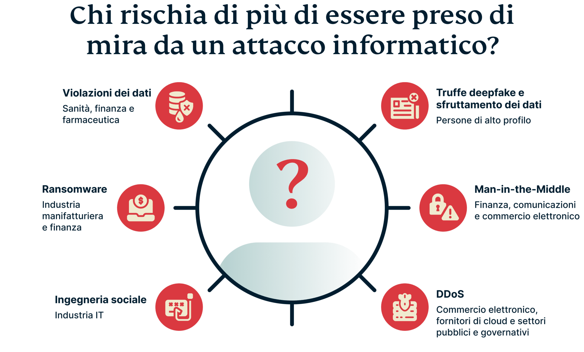 Gli attacchi informatici possono colpire qualsiasi individuo o azienda, ma alcuni settori sono più suscettibili a causa della natura delle loro operazioni e della sensibilità dei dati che gestiscono. Settori come la sanità, la finanza e la vendita al dettaglio, che sono parte integrante della vita quotidiana delle persone, sono particolarmente vulnerabili.