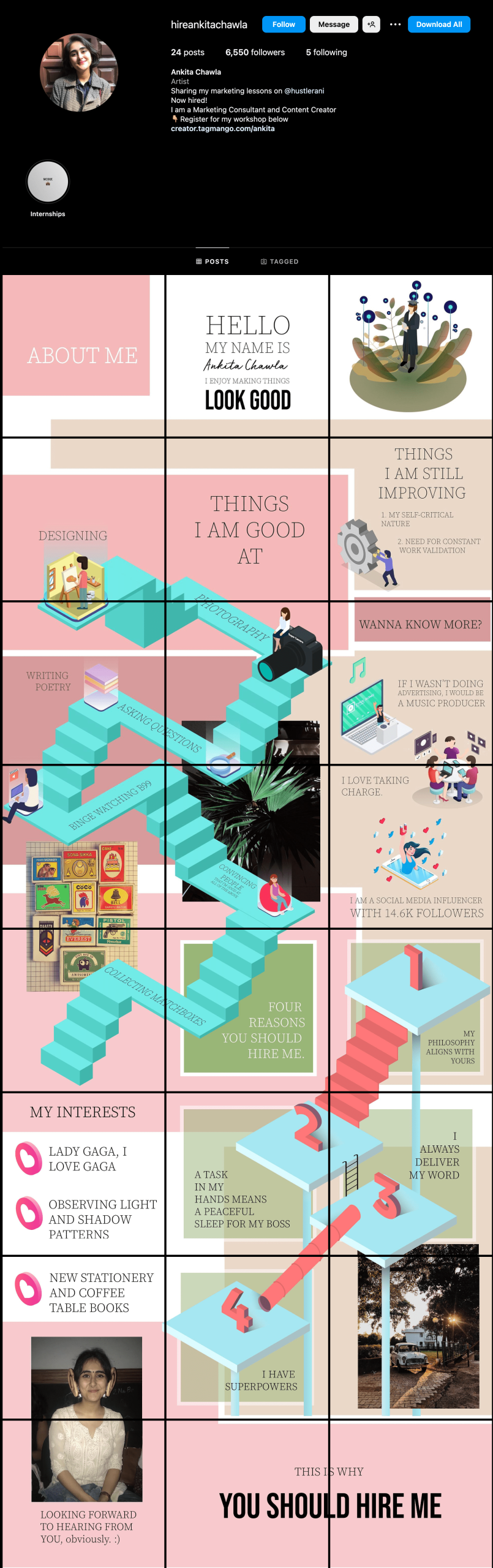例えば、インドに拠点を置くユーザー、アンキタ・チャウラさんは、個人のInstagramアカウントを自分のスキルや能力をクリエイティブに紹介するものに変えました。彼女は履歴書をコラージュとしてデザインしてプロフィールに投稿したことで、インドのDeloitte社のビジュアルクリエイターとして採用されました。