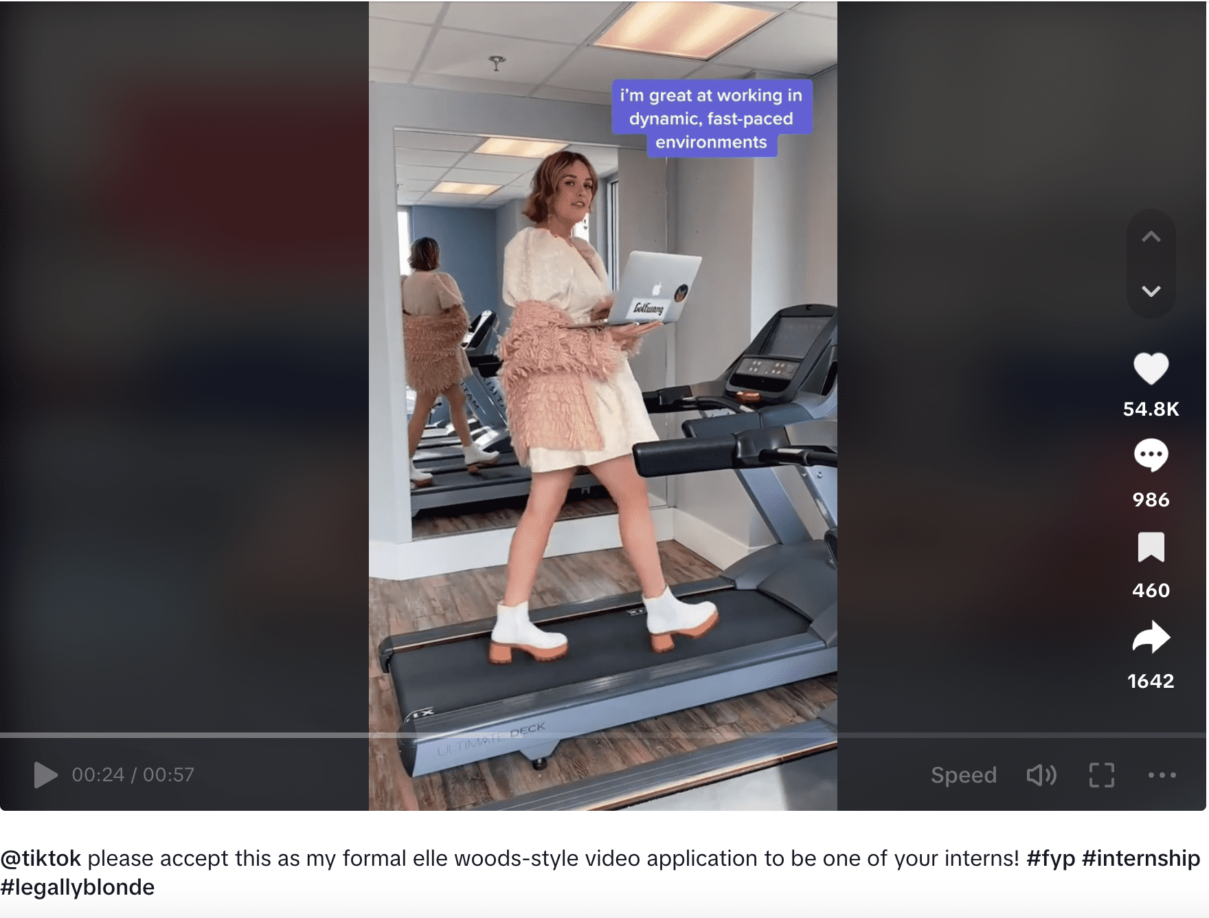 ユタ州ブリガムヤング大学の元学生、カリ・ロバーツさん(25歳)も、TikTokレジュメで仕事に就くことができた1人です。米国映画「キューティ・ブロンド」にインスピレーションを得たビデオレジュメを投稿後、彼女はTikTokのグローバルビジネス部門でインターンシップをすることに成功しました。「ダイナミックでペースの速い環境で働くのが得意なんです」と、ランニングマシーンに乗りながらロバーツさんは言います。