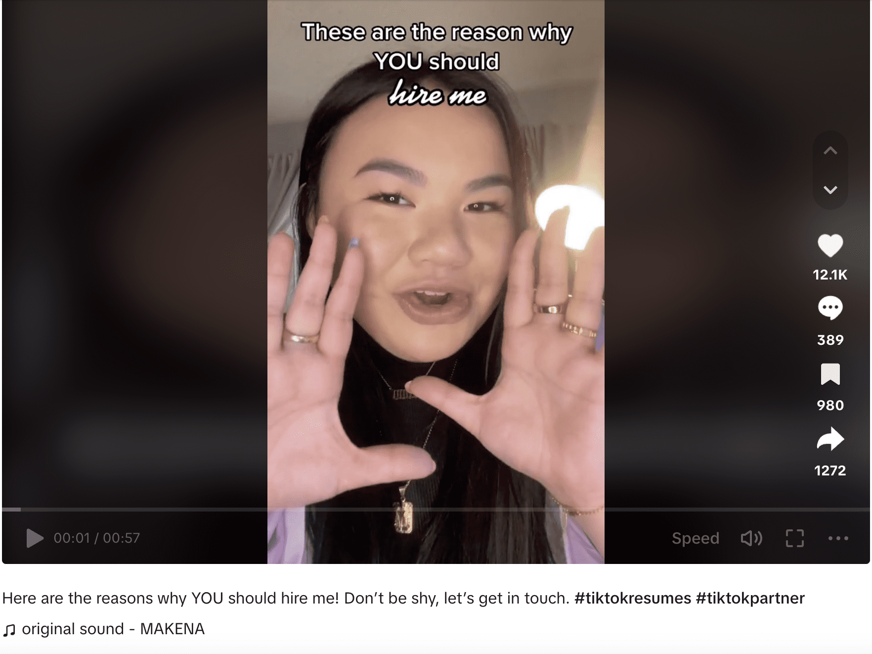 シアトル在住の求職者、マケナ・イーさん(23歳)は、TikTokレジュメのサクセスストーリーの一例です。彼女のビデオレジュメが急速に拡散し、「誰か雇ってあげてー!」といったコメントを含む何百万もの視聴と数百のコメントが寄せられた後、イーさんは15件以上の仕事の紹介を受けました。