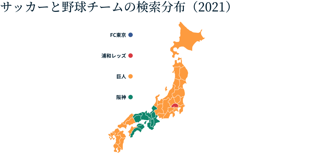 まず、上記の日本地図が示す通り、4チームの中では、全国的に野球の2チームが優勢でした。「巨人」で検索する都道府県が多いものの、関西方面ではやはり「阪神」の基盤が強いと言えます。また、「浦和レッズ」の埼玉県は、全国で唯一、野球を抑えてサッカーへの関心が高いことを証明しました。