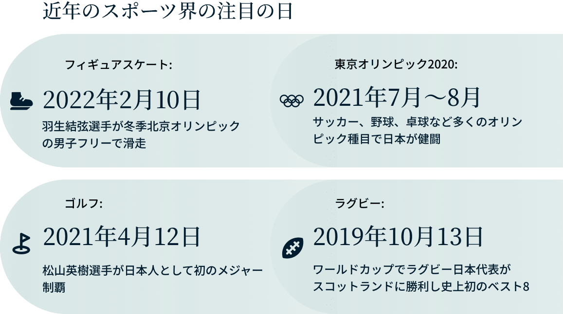 2019年10月のラグビー日本代表の快挙は記憶に新しく、チーム目標だったベスト8を達成して話題となりました。2021年4月はゴルフで松山選手がマスターズ・トーナメントを制して日本人初のメジャー制覇という快挙を成し遂げたこともあり、ゴルフの人気を押し上げた一因と言えそうです。2021年の東京オリンピックは、日本はもちろん世界が注目した大会となりました。また、日本でのフィギュアスケートの人気は非常に高く、直近では、2022年2月の冬季オリンピックでの羽生結弦選手の健闘が多くの注目を集めました。