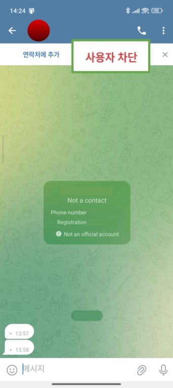 - 계정 탈취: Telegram 지원팀을 사칭한 가짜 메시지를 받을 수 있습니다. 이들은 로그인 코드를 요구하며, 사용자가 이를 넘기면 계정을 탈취해 사용자 본인을 차단합니다.