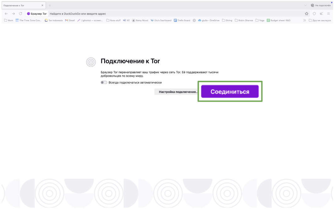 Установите браузер, откройте его и нажмите Подключить. Tor автоматически установит приватное подключение к своей сети. На этом всё.