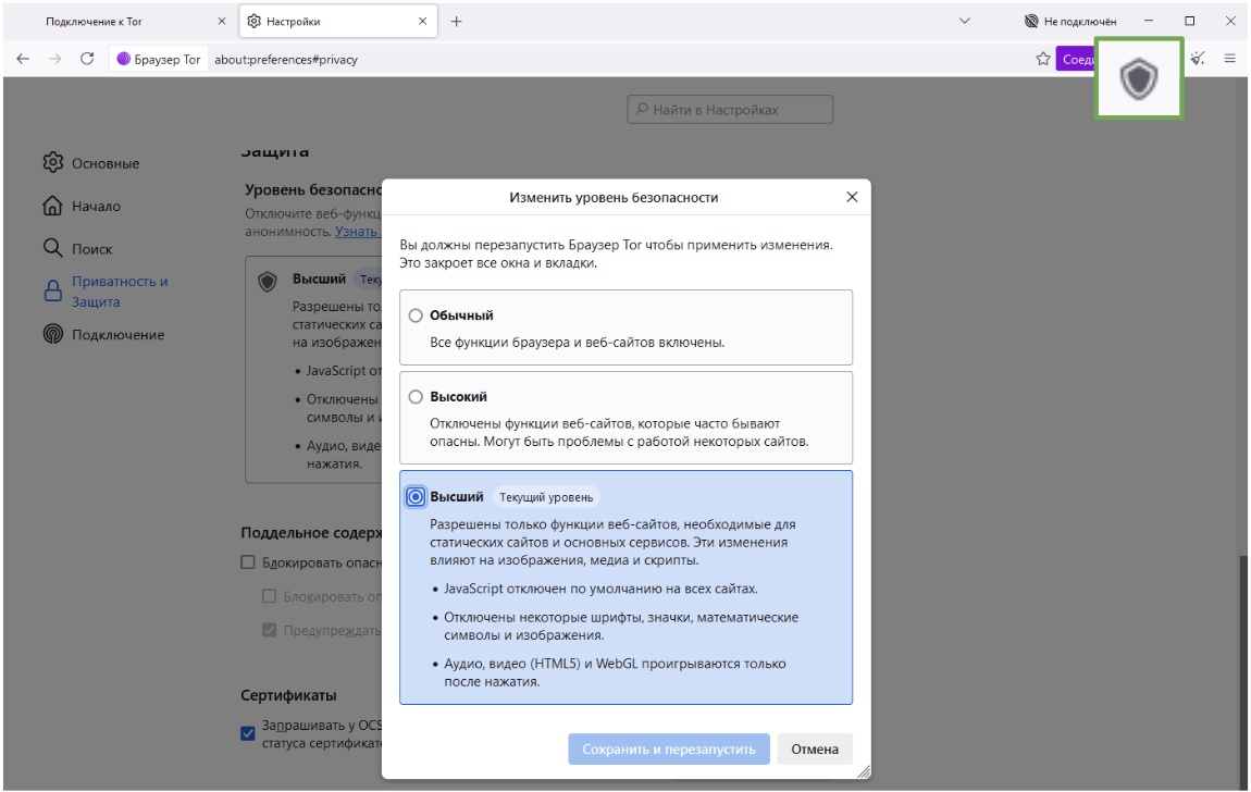Сам браузер уже готов к работе, но для дополнительной защиты нажмите на значок в виде щита и выберите «Самый безопасный» режим работы (при котором отключается JavaScript), также старайтесь не менять размер окна браузера и не использовать полноэкранный режим — некоторые сайты могут отслеживают пользователей на основе размера окна браузера. Tor использует технологию маскировки размера окна браузера за счет добавления невидимых границ для защиты от сбора т. н. отпечатков браузера.
