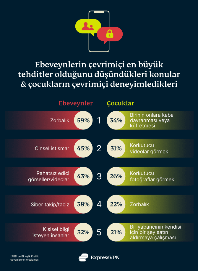 Ebeveynlere en büyük internet tehlikelerinin neler olduğunu sorduğumuzda, katılımcıların %59'u çocuklarının zorbalığa uğramalarından endişelendiklerini belirtti. Bunun ardından ise çocuklarının internette kötü kişiler tarafından güven kazanmak amacıyla kandırılmaları endişesi, çocuklarının internette çirkin içeriklerle karşılaşmaları korkusu ve diğer kullanıcılar tarafından siber takibe veya tacize uğramaları riski geliyor.