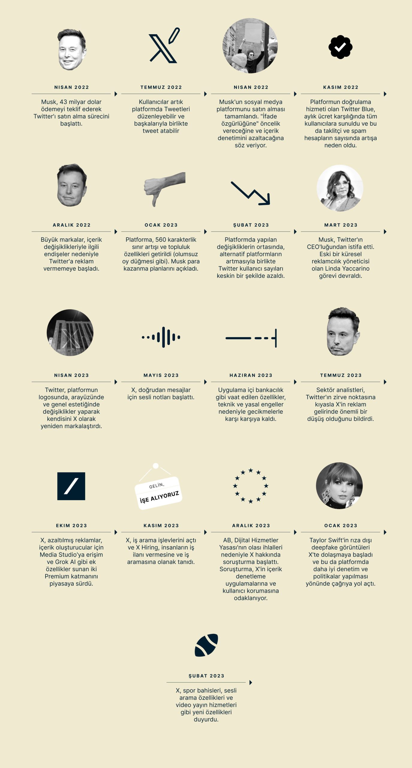 • Satın alımının ardından Twitter, X olarak yeniden markalaşma, şirket işten çıkarmaları, liderlik revizyonu ve çeşitli tartışmalı değişiklikler de dahil olmak üzere büyük dönüşümlerden geçti. Bu değişiklikler, büyük reklamverenlerin kampanyalarını duraklatmalarına veya platformdan tamamen çekilmelerine yol açtı.