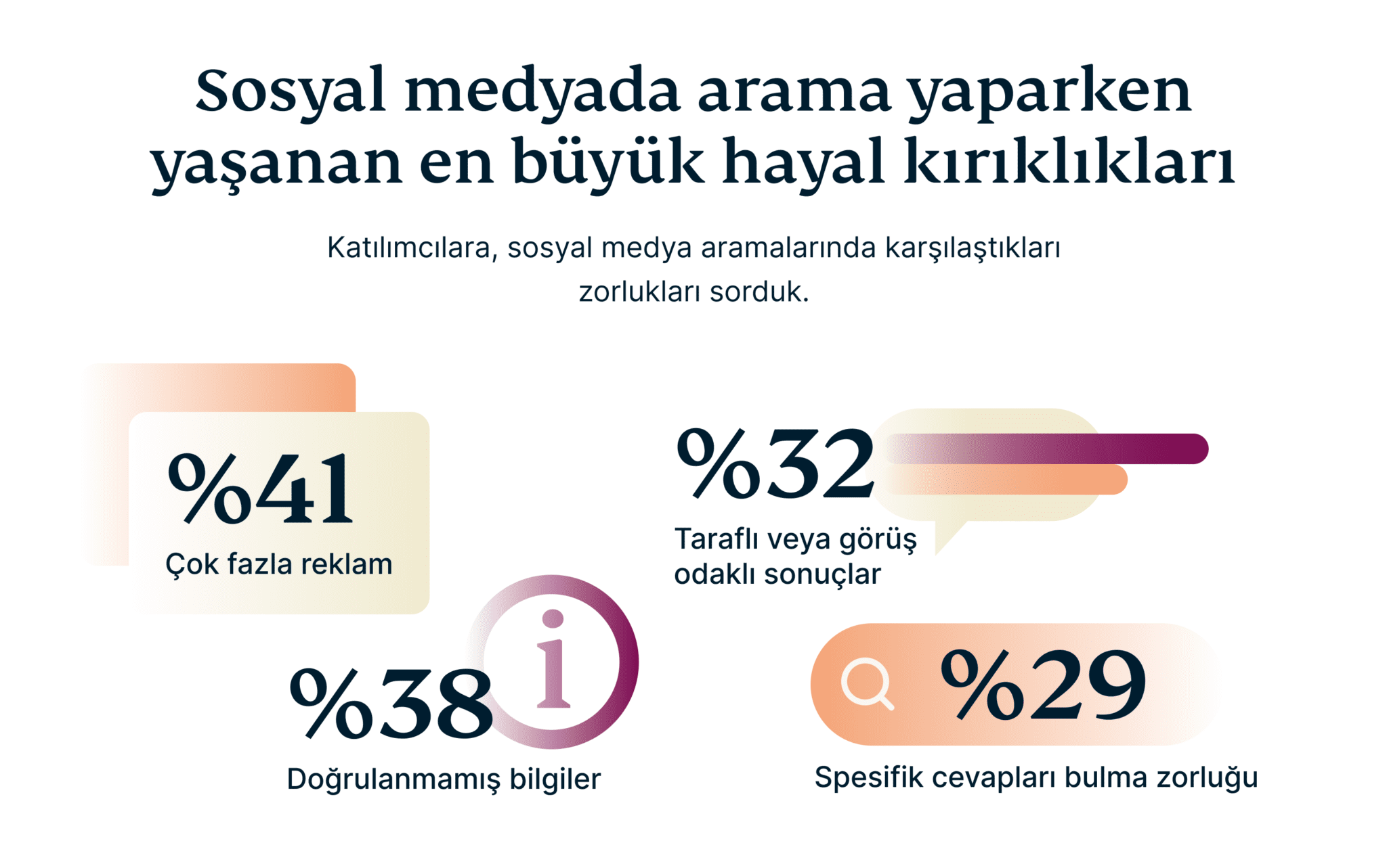 Gerçek zamanlı etkileşimine rağmen, sosyal medya kullanıcıların net veya teknik bilgilere ihtiyaç duyduğunda yetersiz kalabiliyor. Katılımcıların neredeyse %29’u, özellikle niş veya karmaşık konularda belirli yanıtlar bulmakta zorlandıklarını belirtiyor. Dizinli veri tabanlarına sahip arama motorlarının aksine, sosyal medya platformları genellikle hedeflenmiş sonuçlar sunacak yapısal bir sisteme sahip değil.